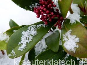 Dein frostfester Skimmien-Mann sieht sehr schön aus. 😉 So ein bisschen Farbe und vor allem Rot tut doch gut in dem Grau und jetzt auch Weiß (wobei ich das Weiß schön finde!). Ich kenne die Skimmie noch nicht so lange und dann auch nur hauptsächlich als Grabbepflanzung, aber ich mag sie. Dass die auch duften kann, ist mir auch neu. In Deinem Garten gibt es immer wieder Interessantes zu entdecken!