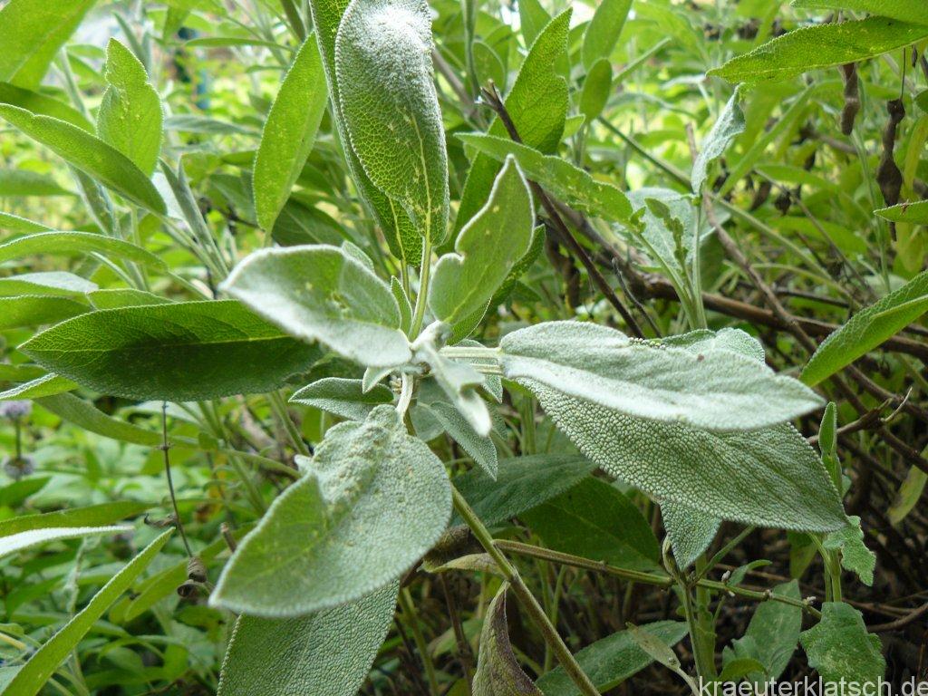 Salbeiblätter sind ein Muss! Heißer Salbeitee hilft mir sofort bei Halsschmerzen und auch bei Erkältungskrankheiten. Man darf die Blätter nur nicht zu lange ziehen lassen sonst wird der Tee bitter.